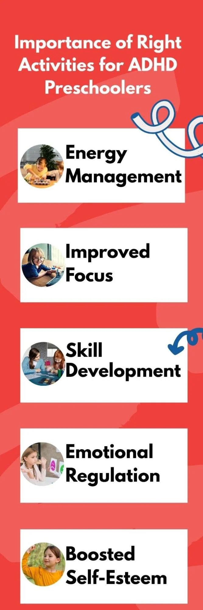 Structured movement, puzzles, block play, trampolining, and role play work well. These activities help manage energy, improve focus, and support emotional control through guided play.